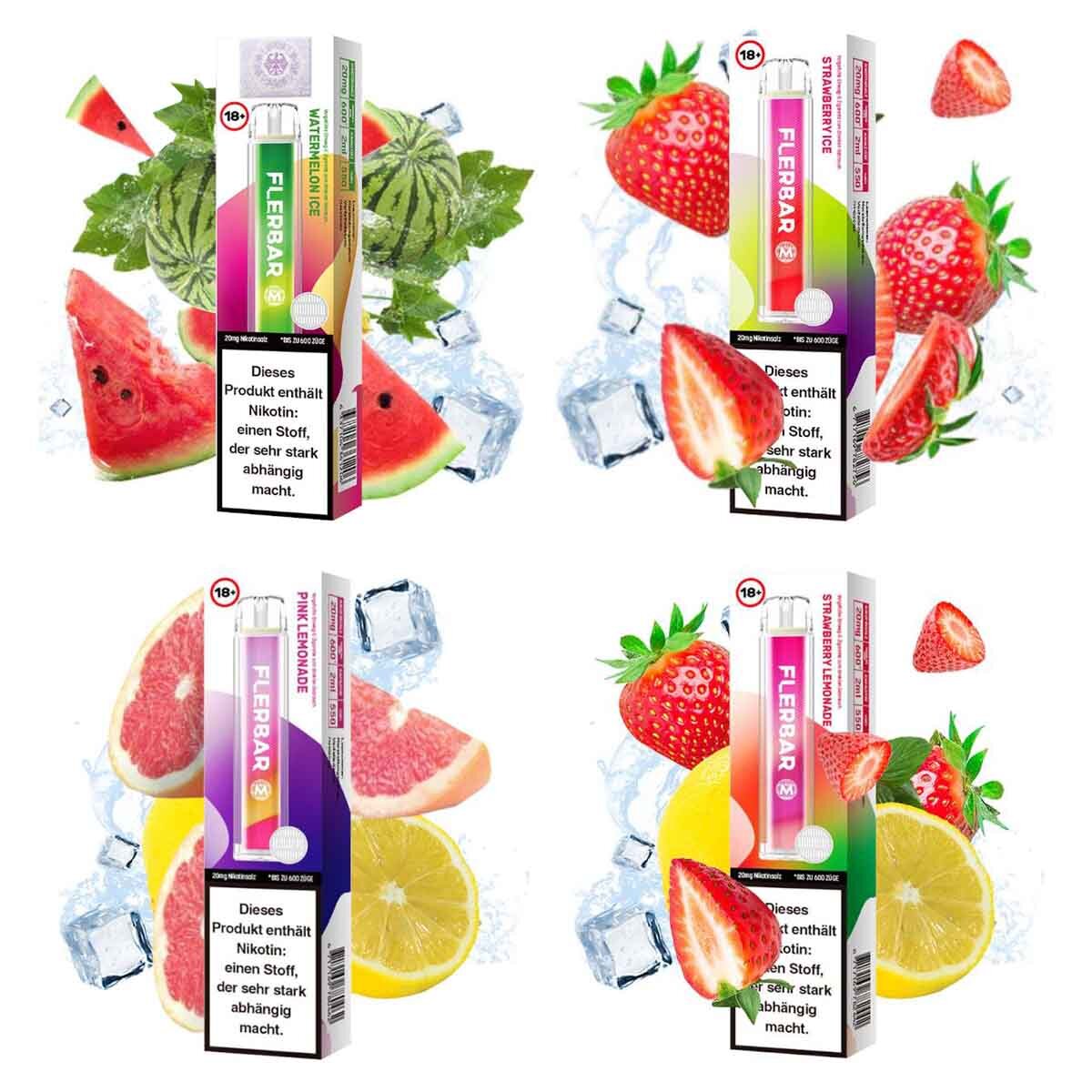 | Flerbar 600 | Alberry, Apple Ice, Apple Ice Nikotinfrei, Banana Ice, Bloody Bull, Blue Razz, Blueberry, Blueberry Nikotinfrei, Caramel Tobacco, Cherry Cola, Cherry Cola Nikotinfrei, Chewy Watermelon, Cola Ice, Double Apple, Grape, Guava Ice, Ice Mint, Ice Mint Nikotinfrei, Lemon, Lychee Ice, Mango Ice, Orange, Passion Fruit, Peach Ice, Peach Ice Nikotinfrei, Pineapple Ice, Pineapple Ice Nikotinfrei, Pink Lemonade, Pink Watermelon, Pink Watermelon Nikotinfrei, Strawberry Ice, Strawberry Ice Nikotinfrei, Strawberry Lemonade, Watermelon Ice |